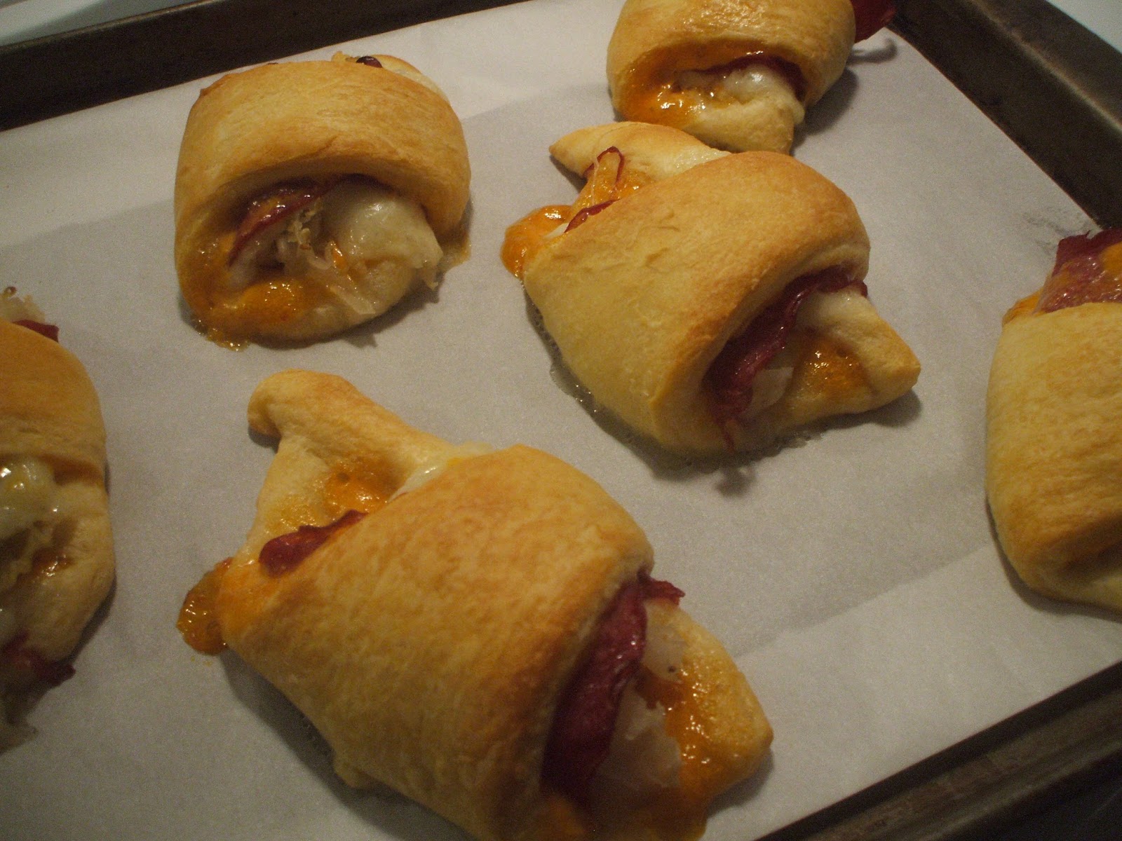 Preheat oven to 350 degrees. Get your crescent rolls ready. On each (of the 8) crescent rolls put 1 T. Thousand Island dressing, 1/2 oz. Corned Beef, 1/2 oz. Swiss Cheese & 2 T. sauerkraut. Roll them up & place on parchment lined cookie sheet.
